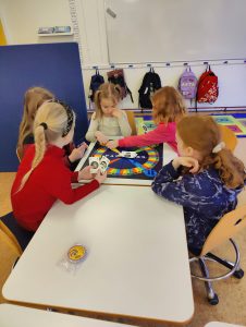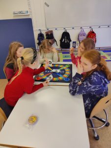 Eldri kenna yngri að spila í Hringekju á Hvanneyri. Nemendur 4. og 5. bekkjar kenndu nemendum 1. og 2. bekkjar á ýmiskonar spil í spilastund.