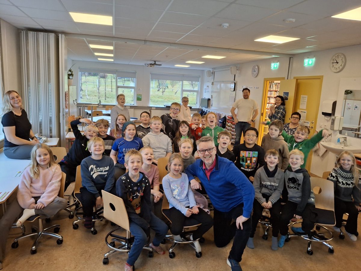 Á dögunum kom Gunnar Helgason rithöfundur og las fyrir nemendur 3.-7. bekkja úr nýrri bók sinni Birtingur og símabannið mikla. Það er ekki ofsögum sagt að hann heillaði krakkana með lestri sínum og bíða þau spennt eftir að bókin komi á bókasafnið.