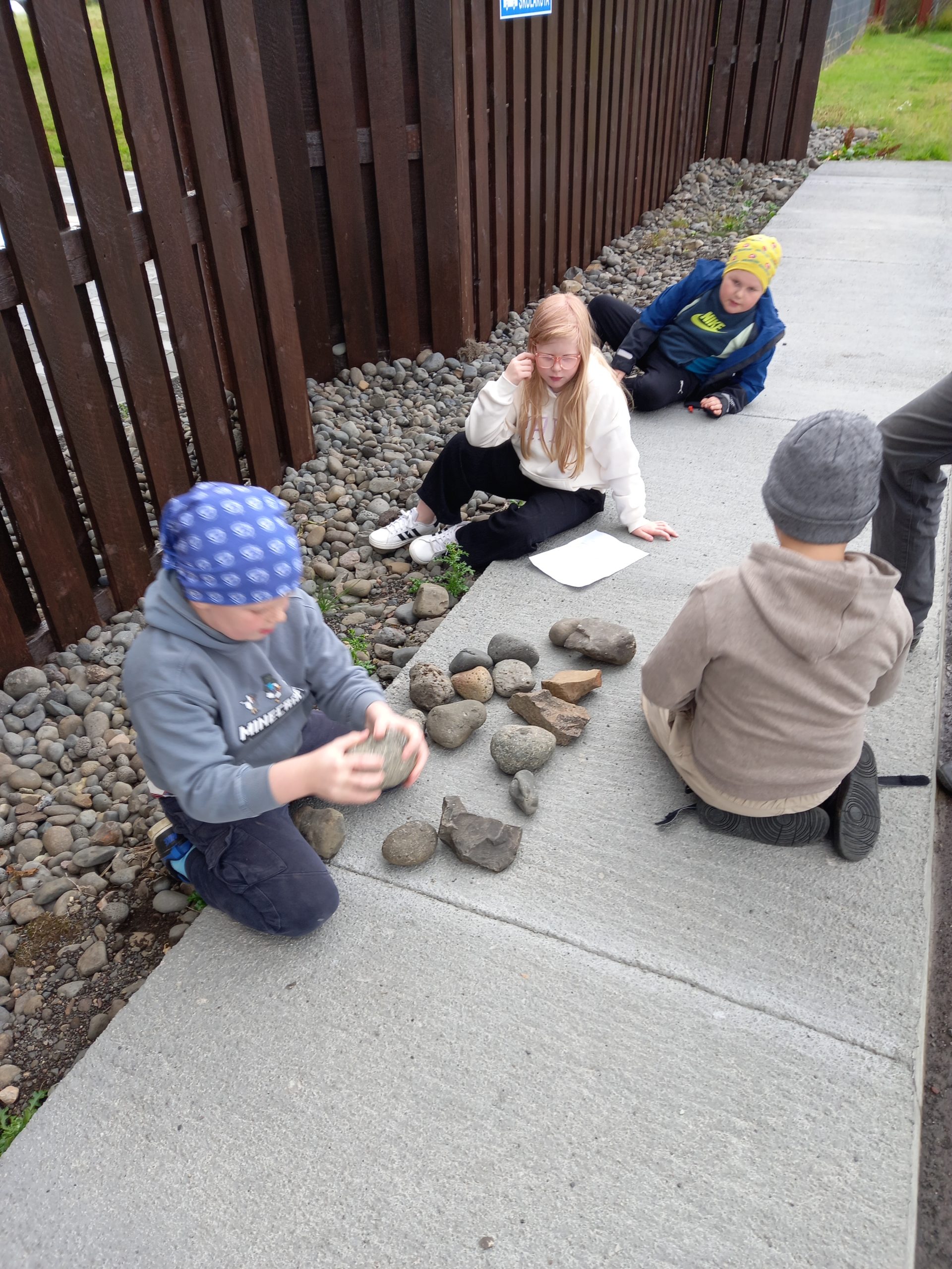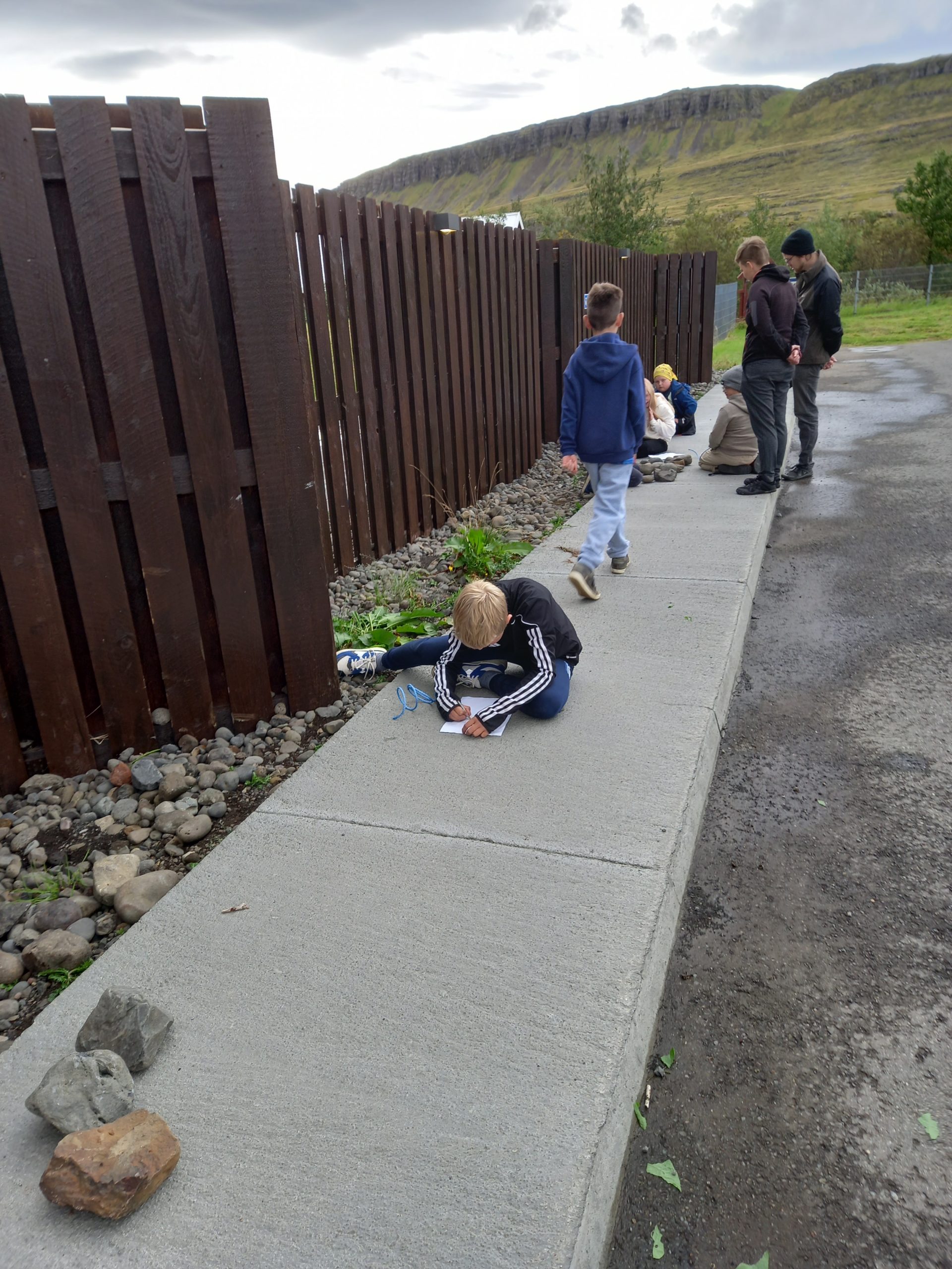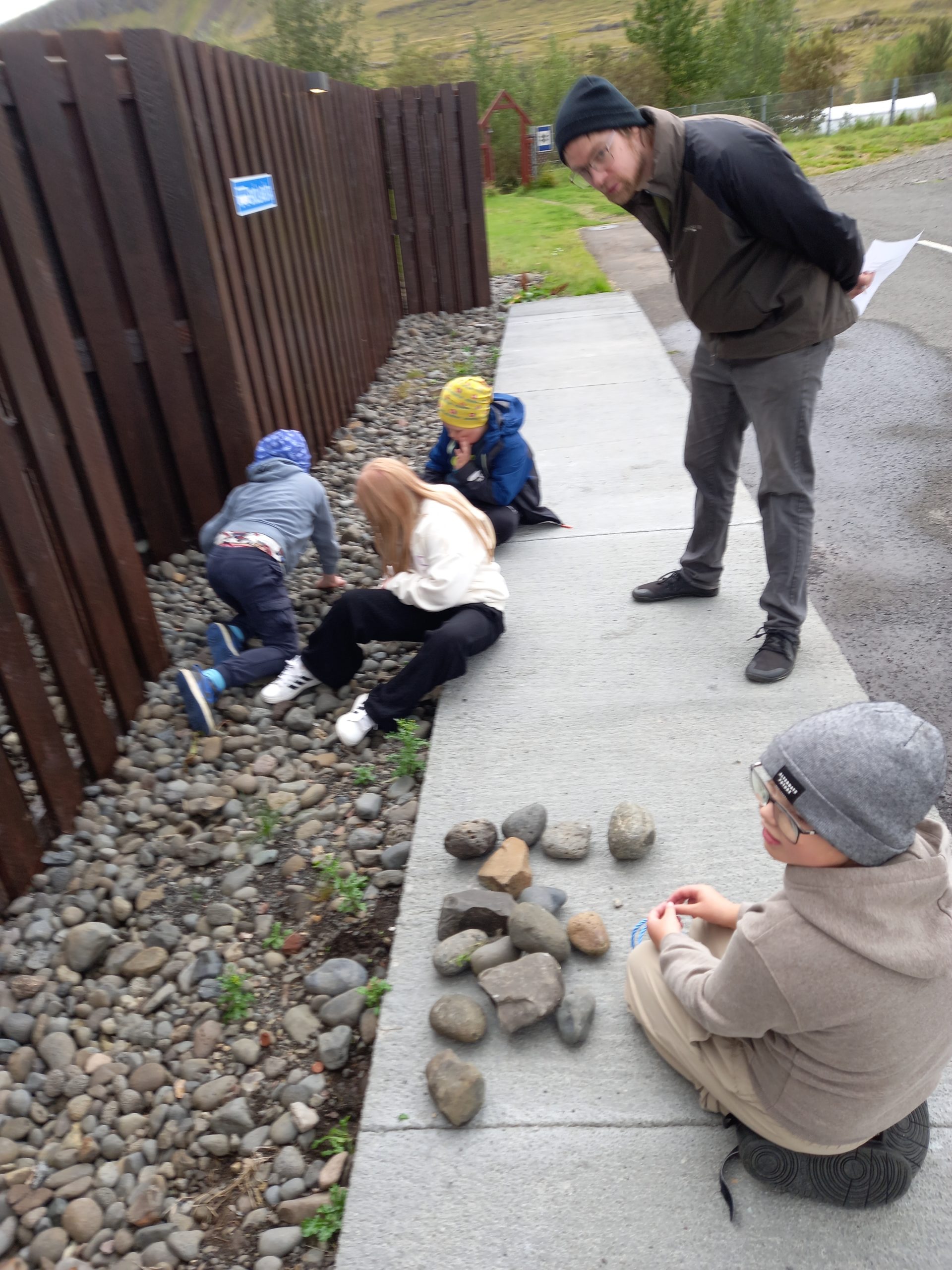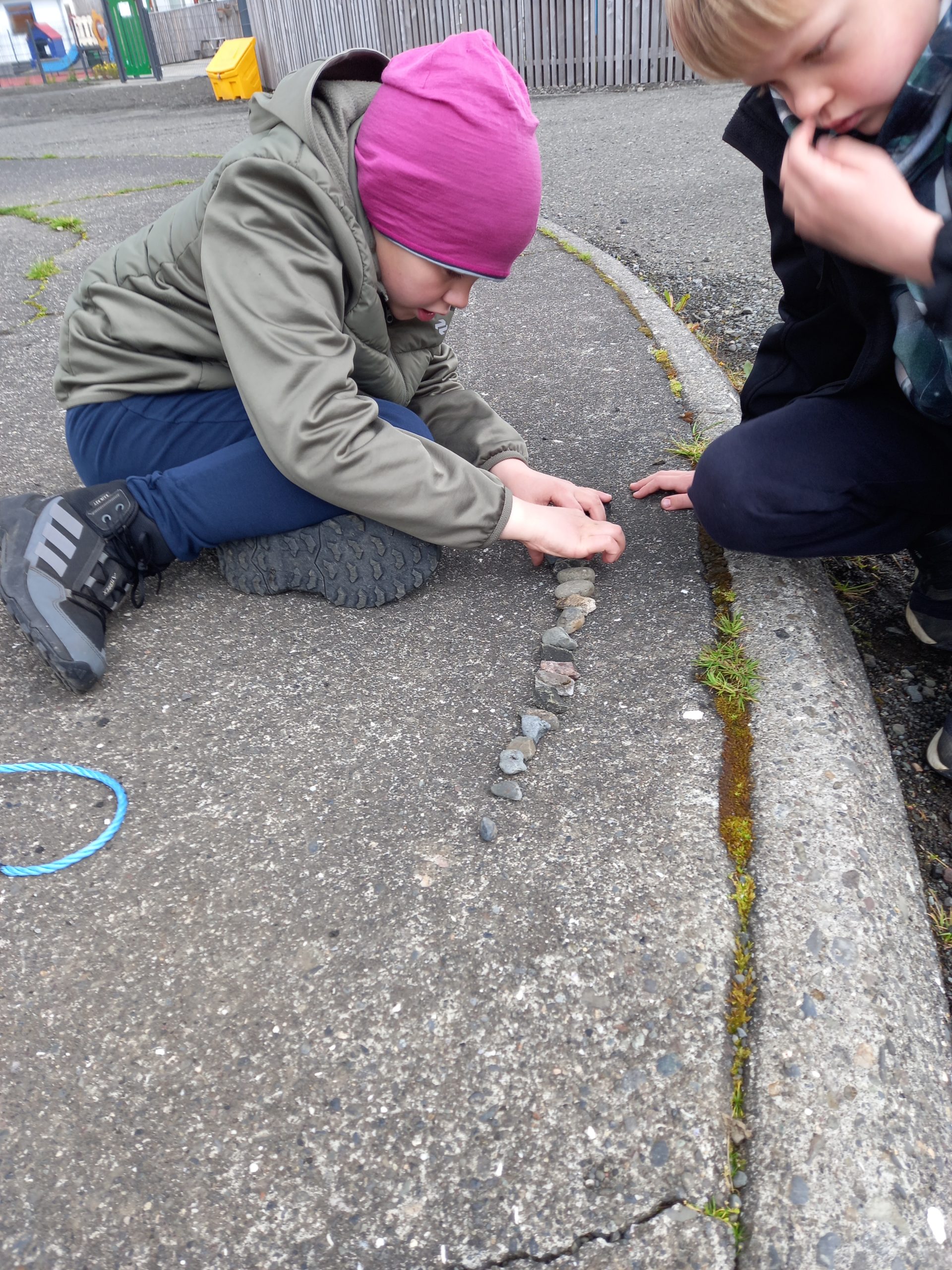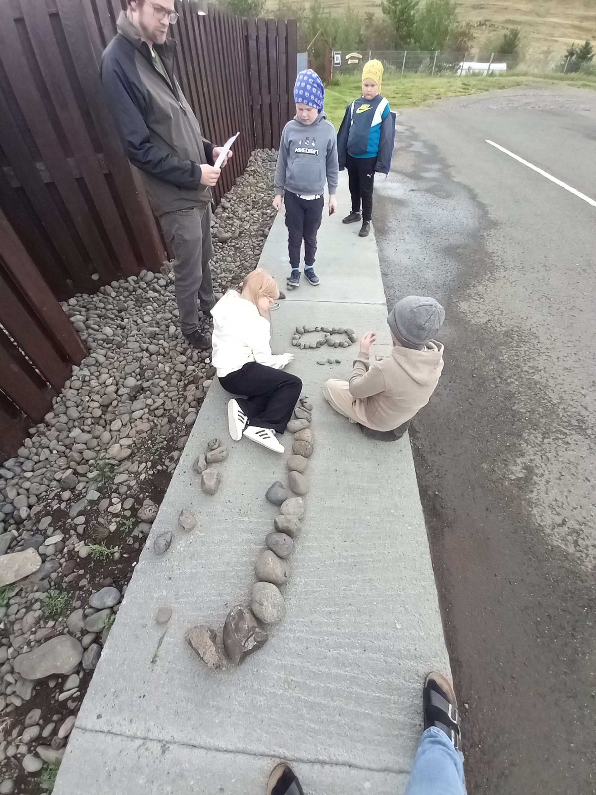 Í fyrstu vikunni fór 3. og 4. bekkur út fyrir skólastofuna til að njóta veðurblíðunnar og prufa sig áfram í öðrum aðferðum við námið. Hópnum var skipt upp í þrjár einingar, sem reyndi á samvinnu í verkaskiptingu og skapaði einnig passlegan keppnisanda milli hópa. Verkefnið fól í sér lengdarmælingar, finna form og mismunandi horn ásamt verkefnum með steinum. Nemendur fengu með sér kaðalspotta sem var notaður við ýmsar mælingar á skólalóðinni ásamt því að telja hænuskref á milli staða. Það reyndi pínu á nemendur að átta sig á að formin sem við erum oft að vinna með í stærðfræðinni eru allt í kring um okkur. Þau þurftu t.d. að finna átthyrning, og átti það að vera snúnasta formið að finna, en einn hópurinn áttaði sig fljótlega á að fótboltapannan er átthyrnd. Síðasti hluti verkefnisins var svo að telja steina, raða þeim í stærðarraðir og deila þeim í jafnar hrúgur. Krakkarnir voru áhugasamir og leystu verkefnið með ánægju og prýði.