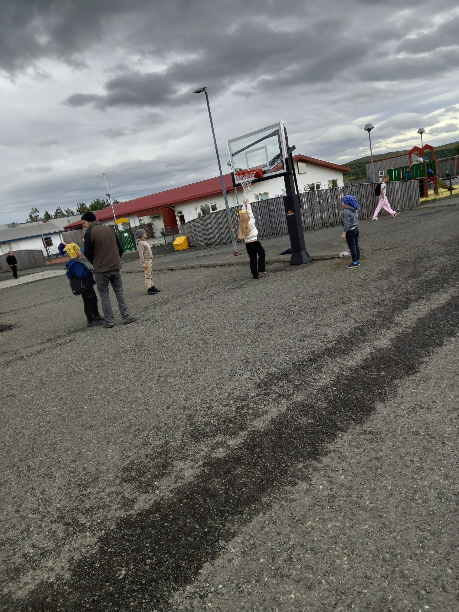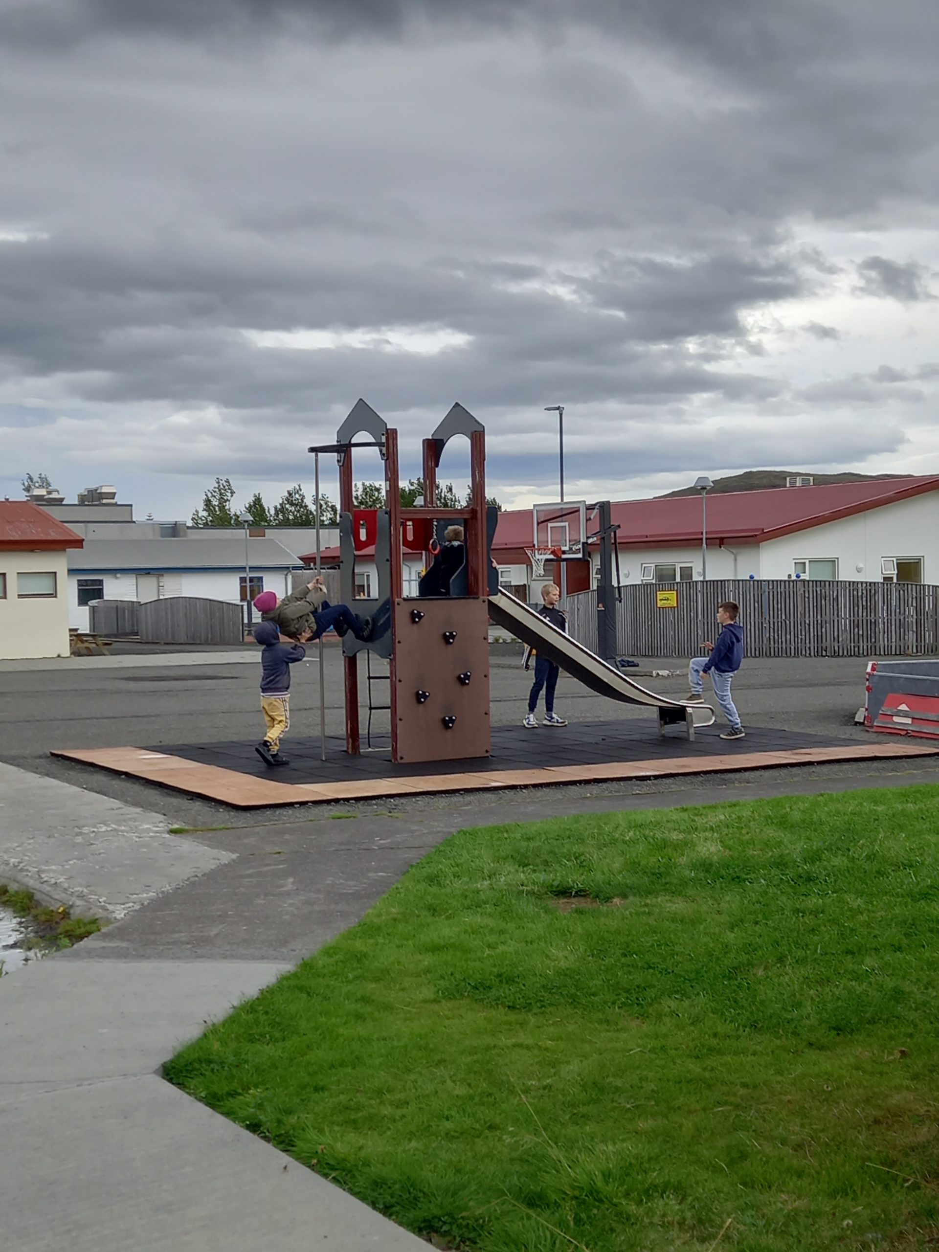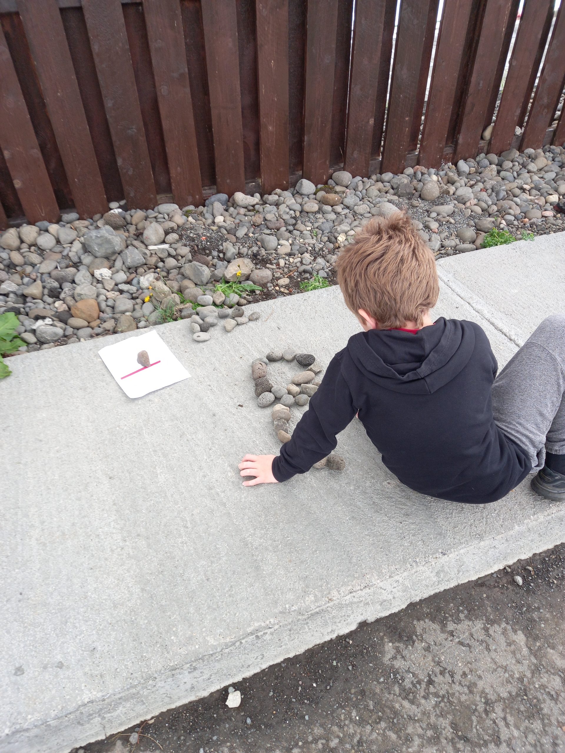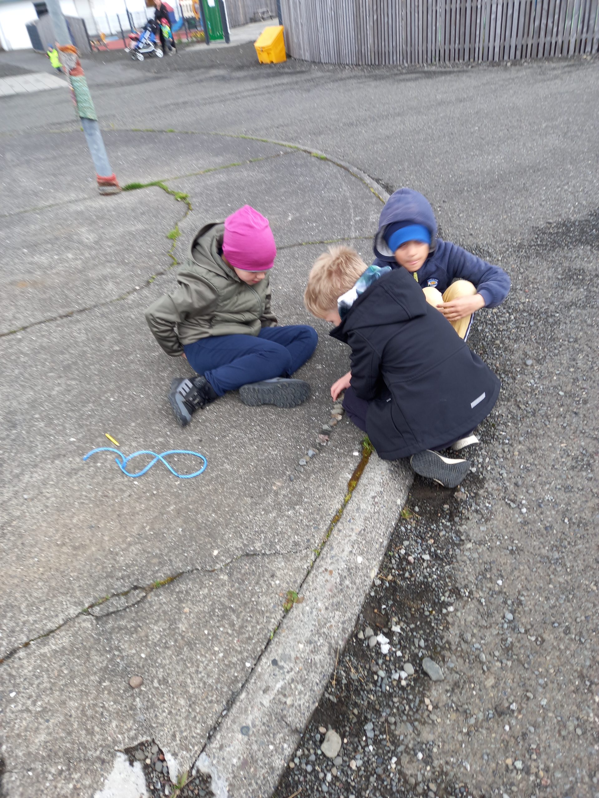 Í fyrstu vikunni fór 3. og 4. bekkur út fyrir skólastofuna til að njóta veðurblíðunnar og prufa sig áfram í öðrum aðferðum við námið. Hópnum var skipt upp í þrjár einingar, sem reyndi á samvinnu í verkaskiptingu og skapaði einnig passlegan keppnisanda milli hópa. Verkefnið fól í sér lengdarmælingar, finna form og mismunandi horn ásamt verkefnum með steinum. Nemendur fengu með sér kaðalspotta sem var notaður við ýmsar mælingar á skólalóðinni ásamt því að telja hænuskref á milli staða. Það reyndi pínu á nemendur að átta sig á að formin sem við erum oft að vinna með í stærðfræðinni eru allt í kring um okkur. Þau þurftu t.d. að finna átthyrning, og átti það að vera snúnasta formið að finna, en einn hópurinn áttaði sig fljótlega á að fótboltapannan er átthyrnd. Síðasti hluti verkefnisins var svo að telja steina, raða þeim í stærðarraðir og deila þeim í jafnar hrúgur. Krakkarnir voru áhugasamir og leystu verkefnið með ánægju og prýði.