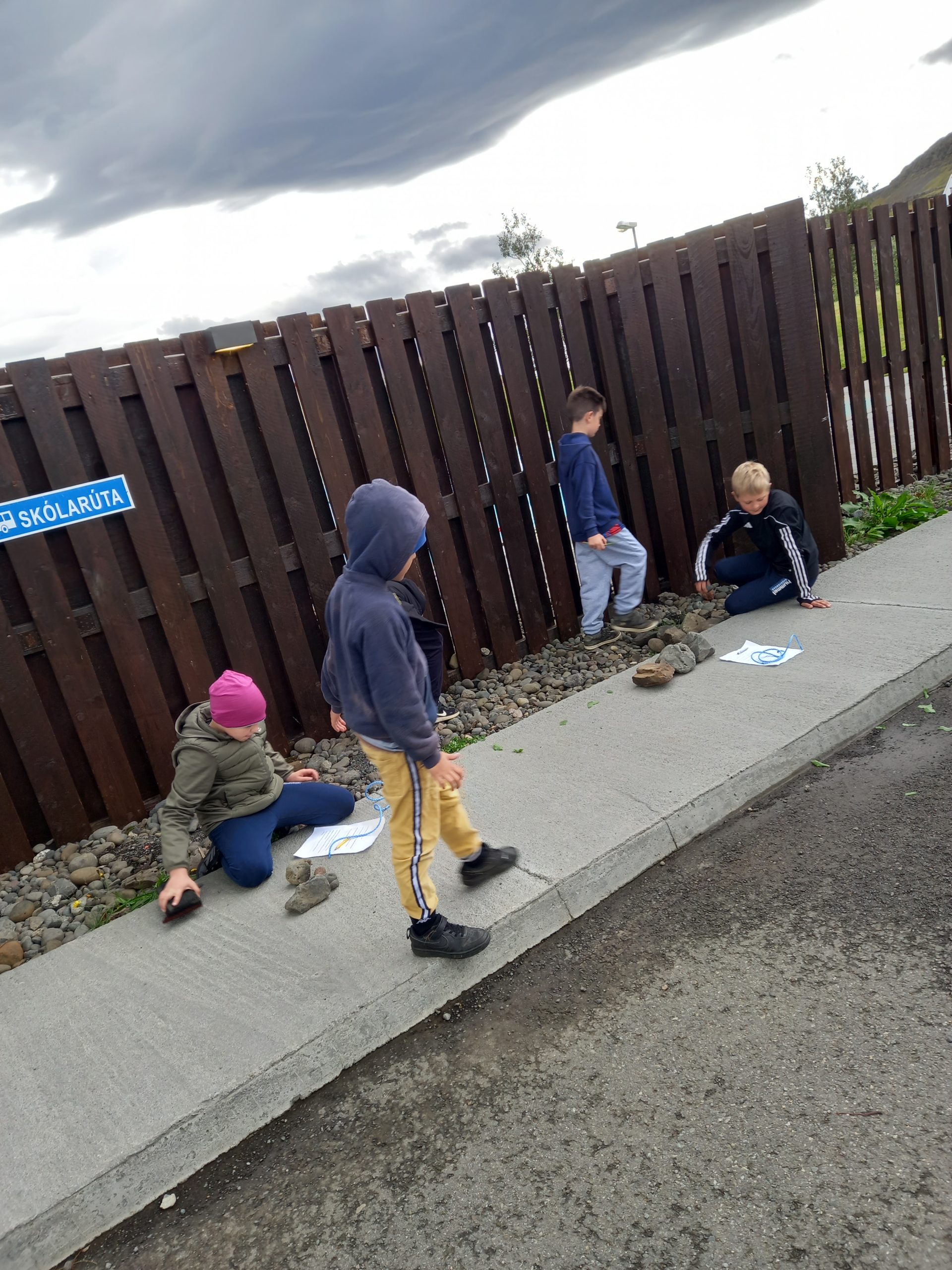 Í fyrstu vikunni fór 3. og 4. bekkur út fyrir skólastofuna til að njóta veðurblíðunnar og prufa sig áfram í öðrum aðferðum við námið.  Hópnum var skipt upp í þrjár einingar, sem reyndi á samvinnu í verkaskiptingu og skapaði einnig passlegan keppnisanda milli hópa. Verkefnið fól í sér lengdarmælingar, finna form og mismunandi horn ásamt verkefnum með steinum. Nemendur fengu með sér kaðalspotta sem var notaður við ýmsar mælingar á skólalóðinni ásamt því að telja hænuskref á milli staða.  Það reyndi pínu á nemendur að átta sig á að formin sem við erum oft að vinna með í stærðfræðinni eru allt í kring um okkur.  Þau þurftu t.d. að finna átthyrning, og átti það að vera snúnasta formið að finna, en einn hópurinn áttaði sig fljótlega á að fótboltapannan er átthyrnd. Síðasti hluti verkefnisins var svo að telja steina, raða þeim í stærðarraðir og deila þeim í jafnar hrúgur. Krakkarnir voru áhugasamir og leystu verkefnið með ánægju og prýði.