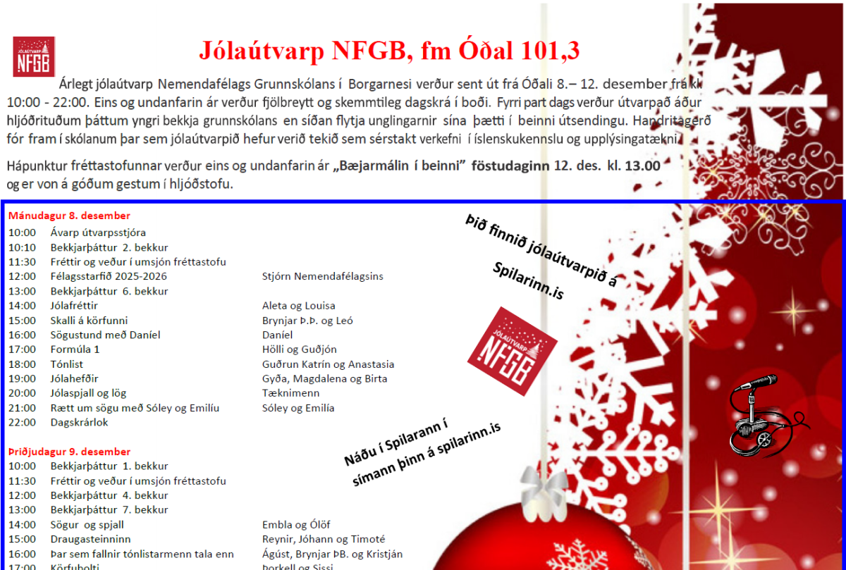 Hægt er að nálgast dagskrá jólaútvarps Grunnskólans í Borgarnesi með því að smella á linkinn hér að neðan: Dagskrá-Jólaútvarps 2025 útg. 4.des.