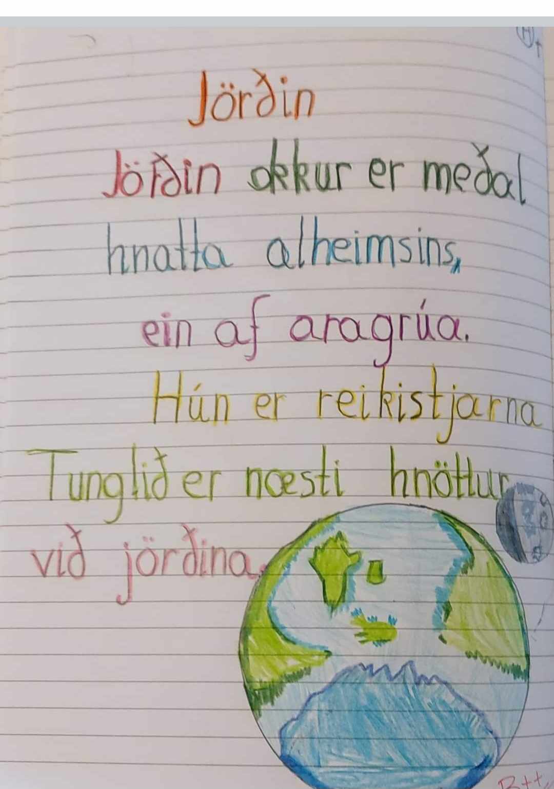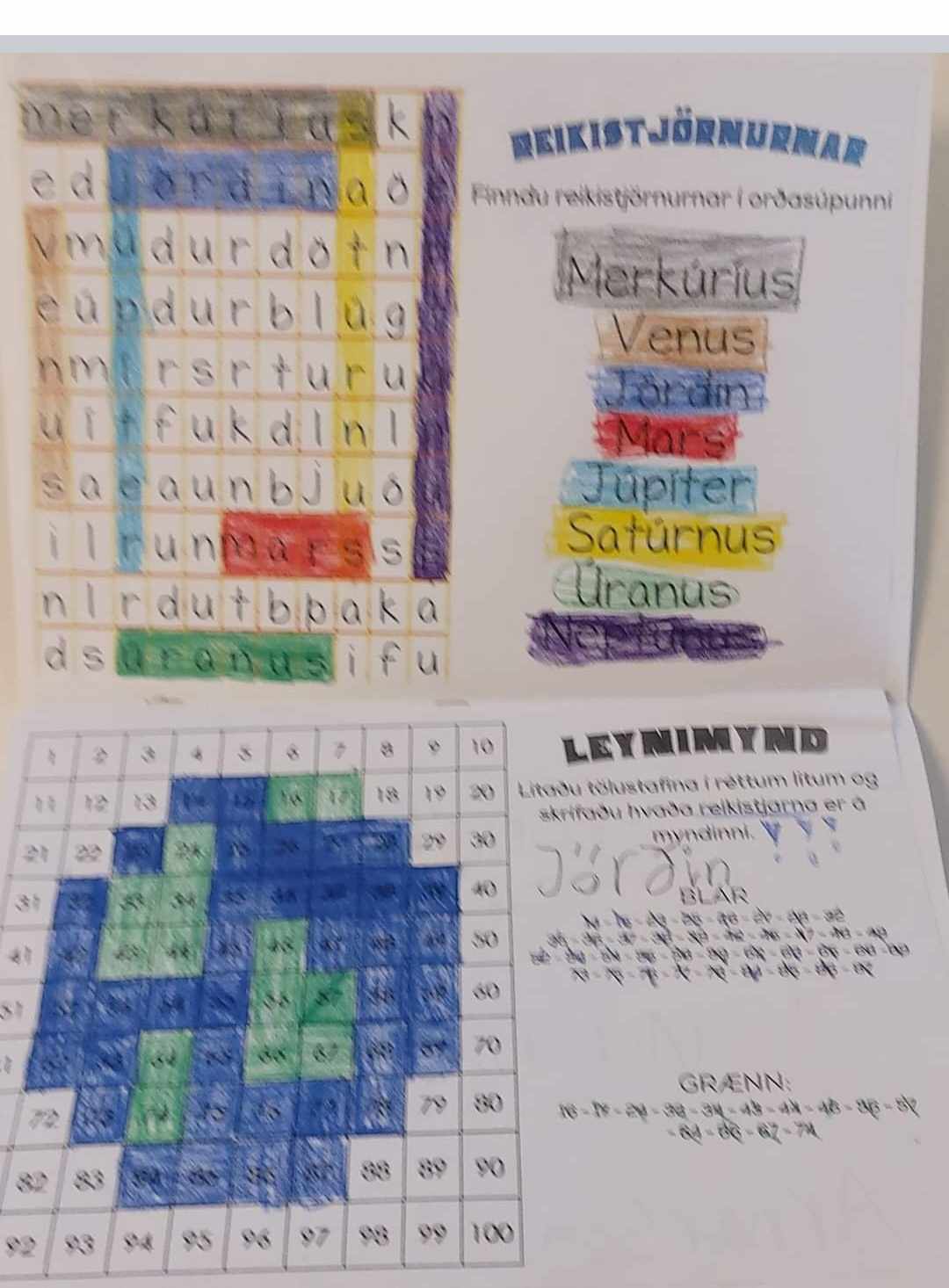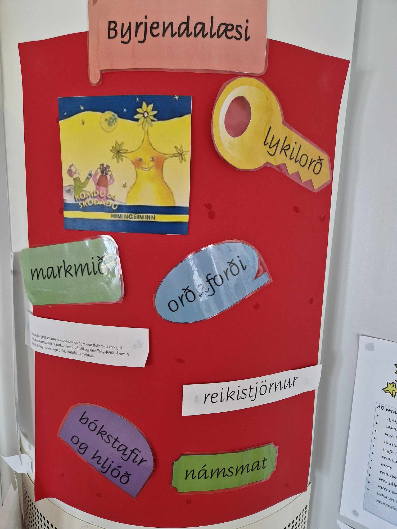 Nemendur 3. bekkjar hafa að undanförnu verið að fræðast um himingeiminn og vinna fjölbreytt verkefni sem samþættist við íslensku, náttúrfræði, samfélagsfræði og upplýsingamennt. Áherslan var á lesskilning, ritun, kyn orða, eintölu og fleirtölu. Verkefnin voru unnin í anda byrjendalæsis og voru ýmist hópa-, para- eða einstaklingsverkefni. Einstaklingsverkefnin voru unnin í stöðvavinnu þar sem nemendur gátu valið í hvaða röð þau unnu verkefnin.