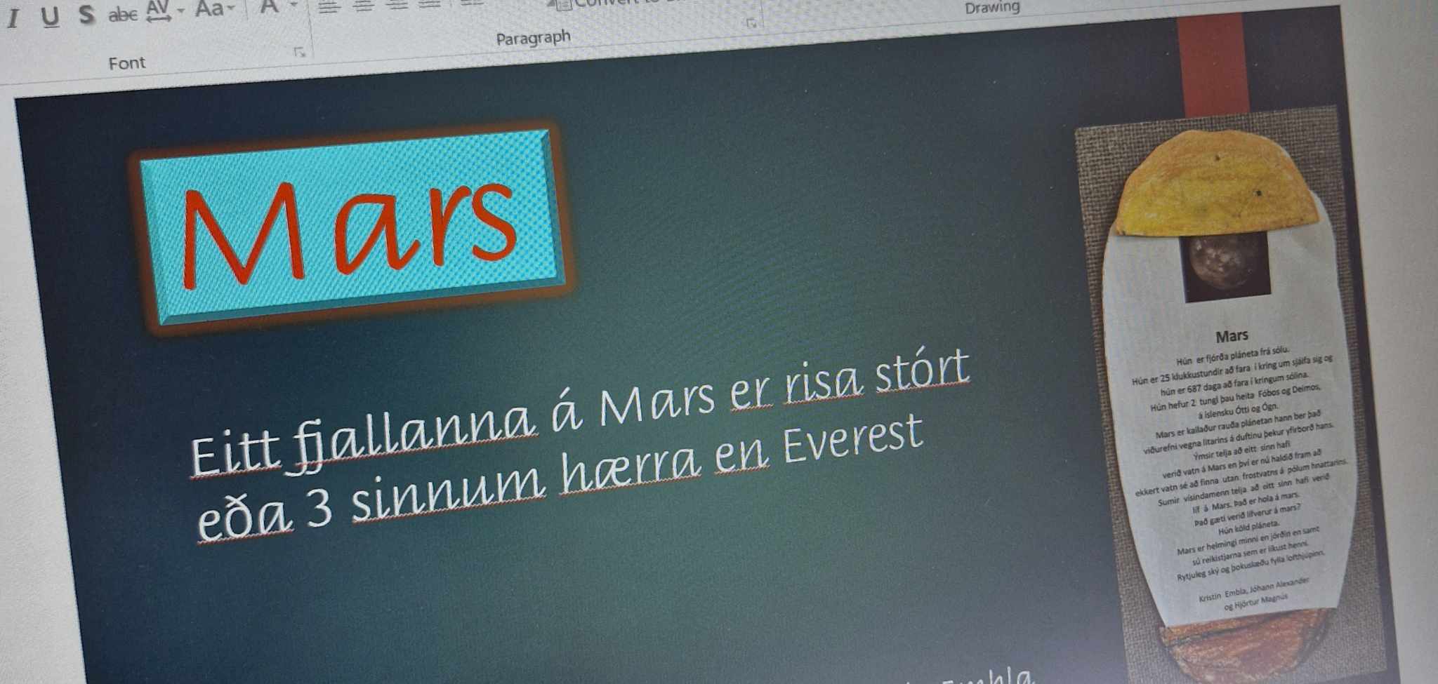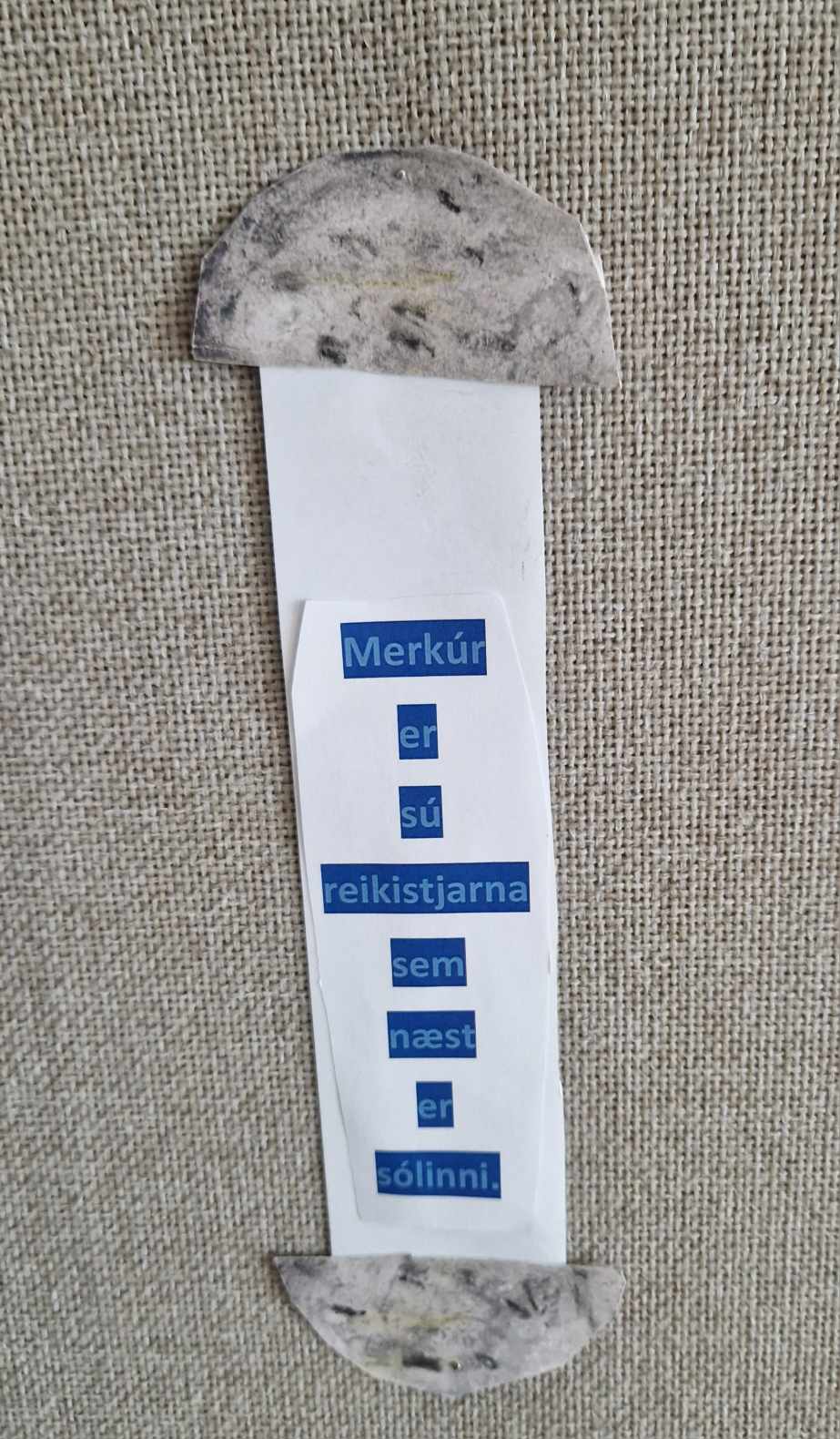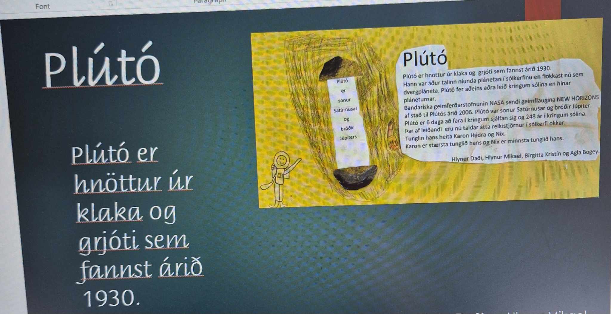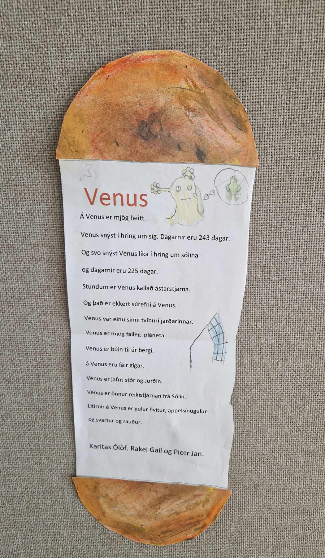 Hópaverkefnið var þannig að hver hópur dró eina plánetu og vann texta um helstu einkenni hennar upp úr efni sem þau fundu bæði í kennslubókum og á netinu. Einnig bjuggu hóparnir til nokkrar spurningar úr textanum til að spyrja áhorfendur. Síðan var plánetan teiknuð upp, klippt í tvennt og textinn var límdur inn á milli. Hver hópur kynnti svo plánetuna sína og spurði spurninga upp úr textanum fyrst fyrir samnemendum og síðan var foreldrum/forráðamönnum boðið og koma og horfa á og skoða afraksturinn í skólastofunni.