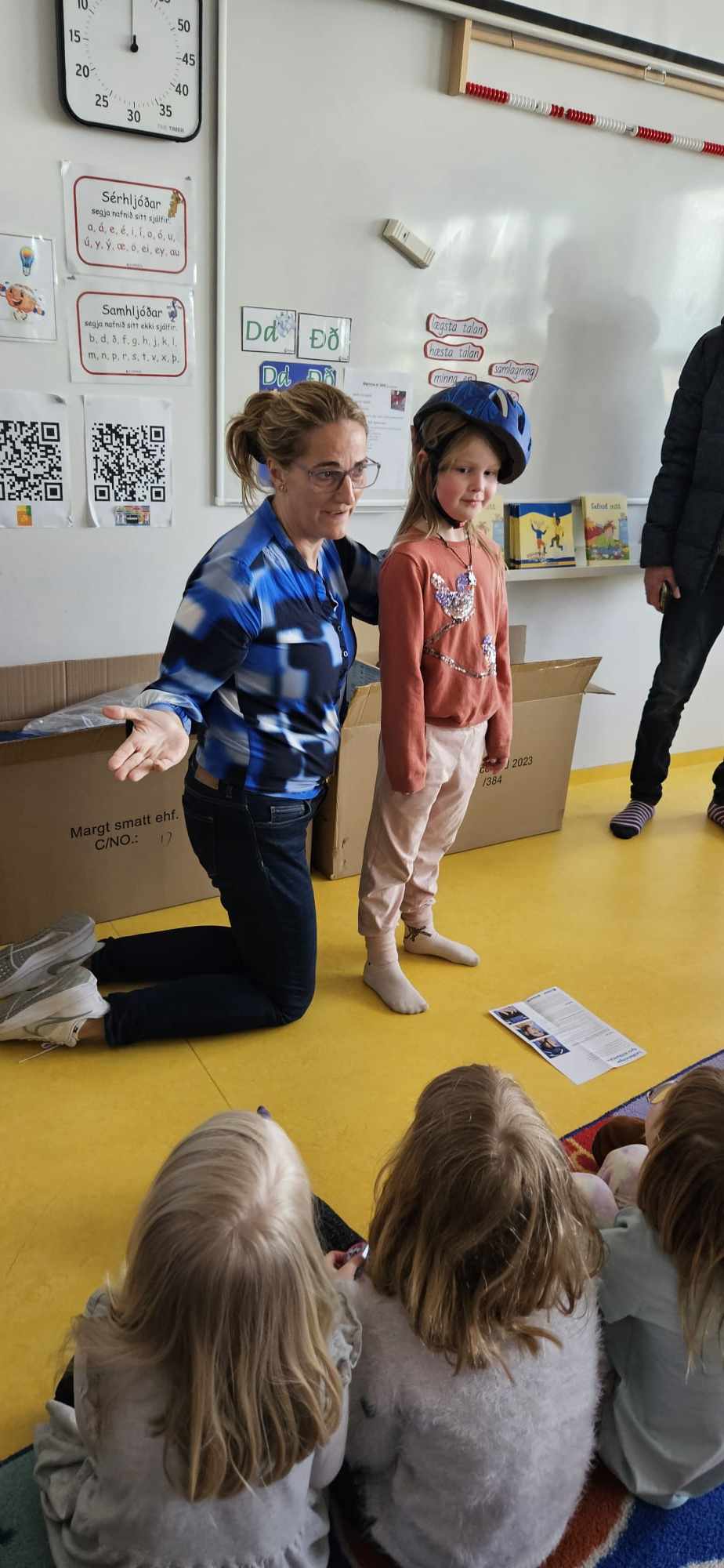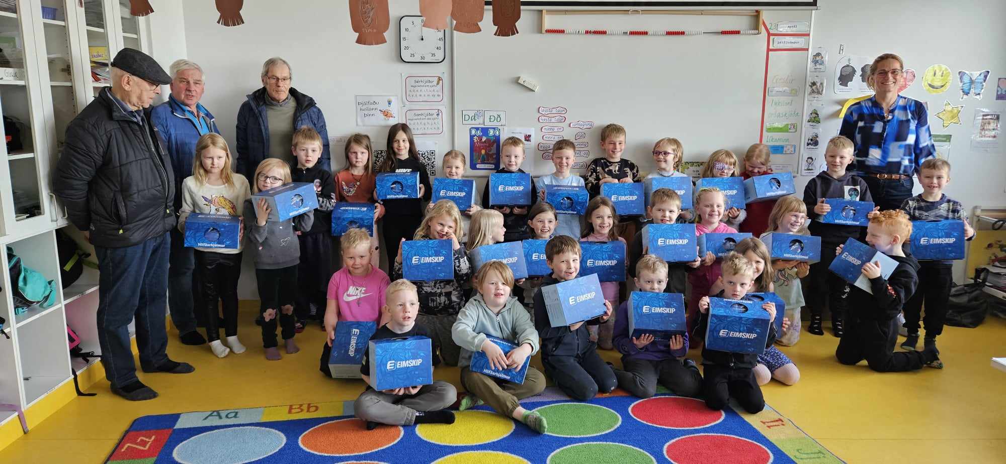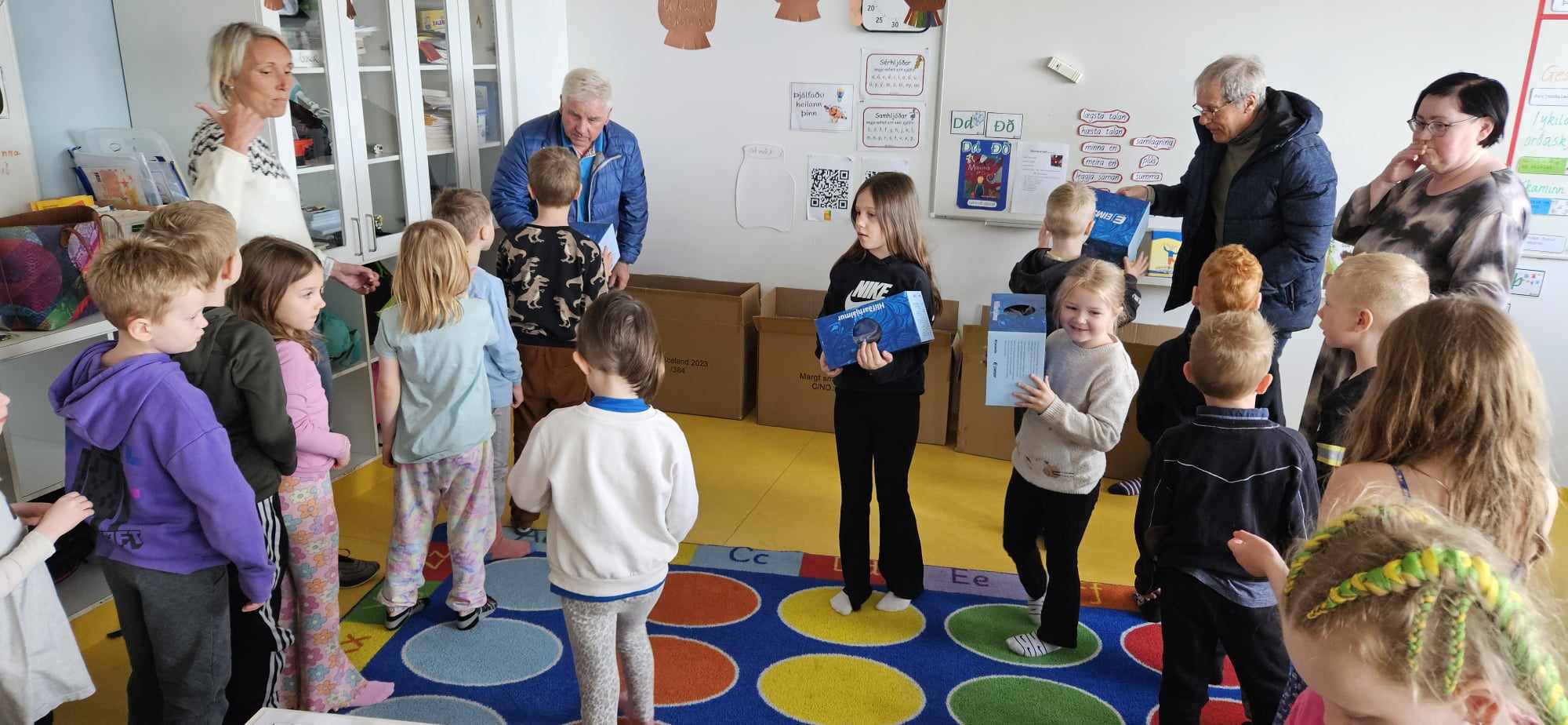 Halldór Jónsson, Sæmundur Óskar Ólason og Kristján Pétursson frá Kiwanisklúbbnum Þyrli á Akranesi komu færandi hendi í dag og gáfu öllum nemendum í 1. bekk reiðhjólahjálm, buff og endurskinsmerki. Með þeim í för var Hildur Karen Aðalsteinsdóttir kennari og fór hún yfir það með krökkunum hvernig á að stilla hjálminn á sig og mikilvægi þess að hafa alltaf hjálm þegar þau hjóla. Þá fengu krakkarnir leiðbeiningar til að taka með heim og sýna foreldrum sínum þessi atriði. Þökkum við Kiwanisklúbbnum Þyrli fyrir þessar veglegu og þörfu gjafir.