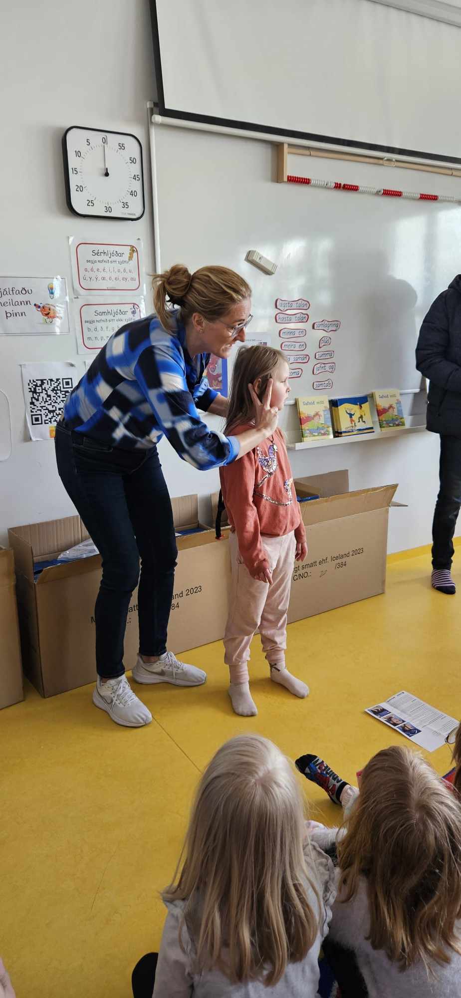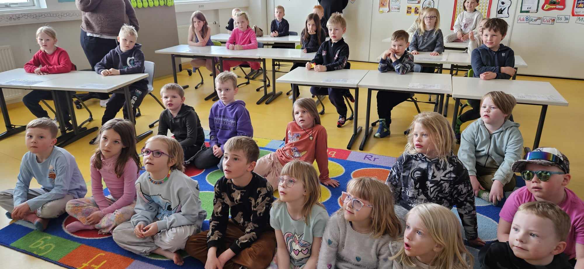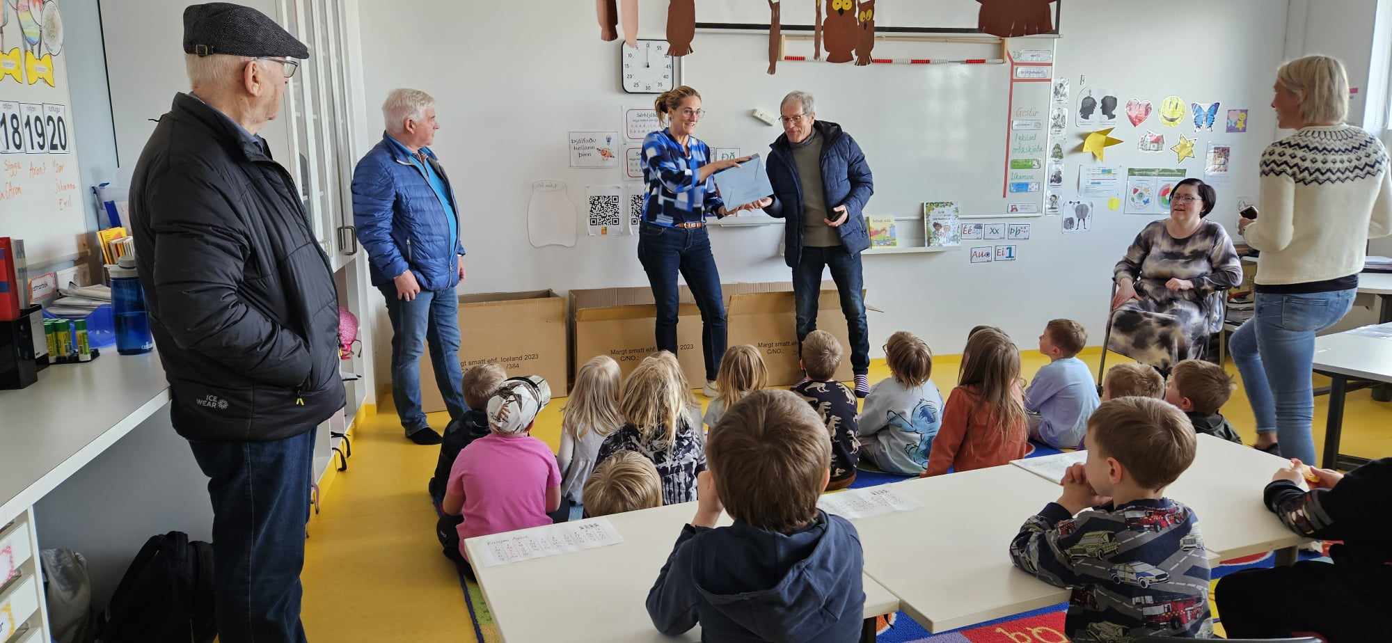 Halldór Jónsson, Sæmundur Óskar Ólason og Kristján Pétursson frá Kiwanisklúbbnum Þyrli á Akranesi komu færandi hendi í dag og gáfu öllum nemendum í 1. bekk reiðhjólahjálm, buff og endurskinsmerki. Með þeim í för var Hildur Karen Aðalsteinsdóttir kennari og fór hún yfir það með krökkunum hvernig á að stilla hjálminn á sig og mikilvægi þess að hafa alltaf hjálm þegar þau hjóla. Þá fengu krakkarnir leiðbeiningar til að taka með heim og sýna foreldrum sínum þessi atriði. Þökkum við Kiwanisklúbbnum Þyrli fyrir þessar veglegu og þörfu gjafir.