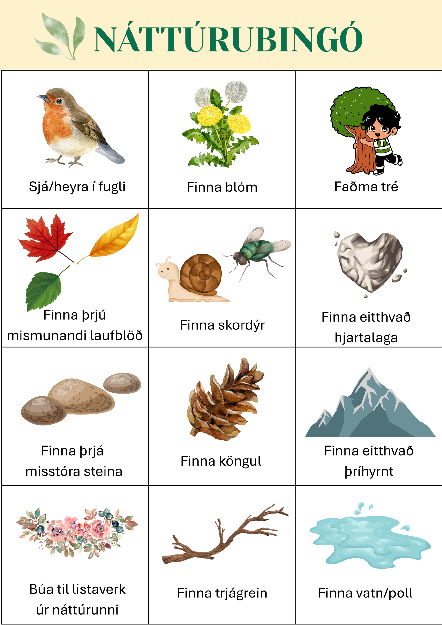 Markmið náttúrubingósins er að njóta náttúrunnar, taka eftir umhverfinu og jafnvel læra eitthvað nýtt í leiðinni, t.d. finna nýtt blóm eða læra heiti á nýjum fugli. Það er hægt að framkvæma bingóið hvar sem er úti í náttúrunni.