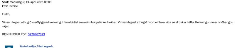 Pósturinn ber heitið “Invoice” eða „Reikningur“ og inniheldur hlekk sem viðtakendur eru hvattir til að opna. Um er að ræða svikatilraun (phishing), þar sem markmiðið er að blekkja fólk til að veita aðgang að viðkvæmum upplýsingum eða setja upp skaðlegan hugbúnað.
